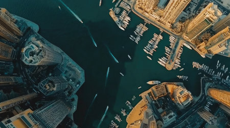 Top view of Dubai Marina district, tall buildings and waterfront, space for urban-themed messages
