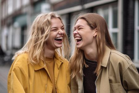 two female friends sharing a joke together in the city, created with generative ai