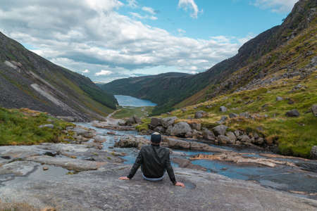 Man is looking at the Glendalough Valley. Wicklow Mountains, Ireland.