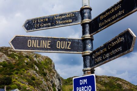 Word writing text Online Quiz. Business photo showcasing game or a mind sport that are published on the Internet Road sign on the crossroads with blue cloudy sky in the background