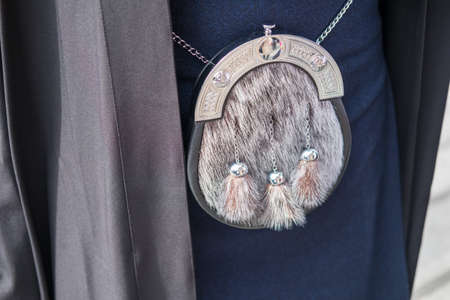 Closeup of traditional Sporran on blue kilt, it is a purse which is a part of male Scottish Highland dress.