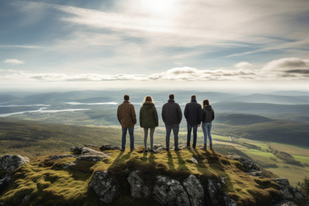 Conquerors of the Wilderness: Four Adventurers at the Summit of a Verdant Mountain