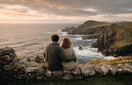Couple sitting on a stone wall overlooking dramatic cliffs and ocean at sunset. Scenic coastal landscape, travel inspiration and quiet moment.