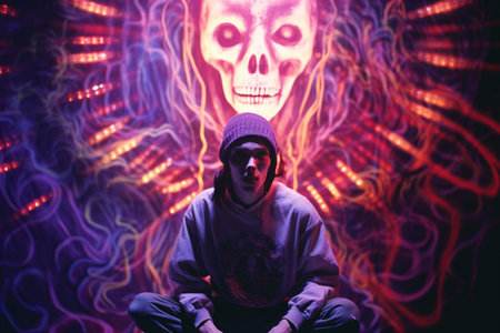 A man stands against a backdrop of radiant graffiti, his silhouette highlighted with bold neon colors. The urban art creates a lively atmosphere rich in creativity and expression.