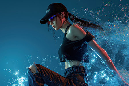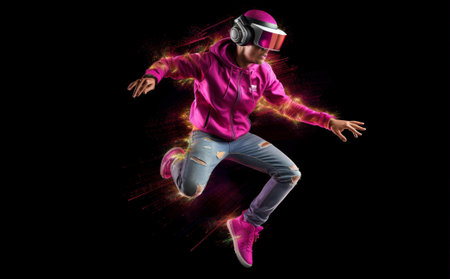 Trendy young teen in action on blue glitter light neon bokeh effect AI technology conccept.