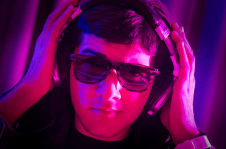 Portrait of trendy young man wearing headphones listening music against neon colored background