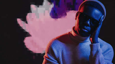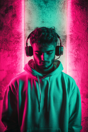 A striking portrait of a man in a vibrant hoodie and cap, surrounded by neon lights. This artistic shot captures dynamic movement and modern street style, conveying energy and confidence.