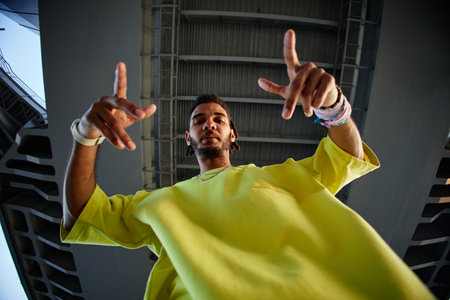 Portrait of young man standing under bridge pointing fingers toward camera wearing bracelets and necklace representing Gen Z youth culture and urban lifestyle