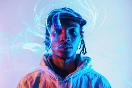 A young man in a baseball cap with a glowing abstract background, showcasing vibrant colors and light trails