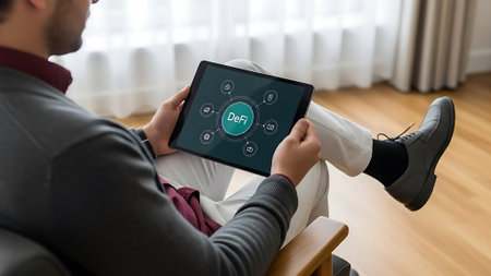Cryptocurrency DAI logo symbol on the screen, digital virtual money and banking concept, top view background