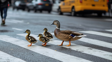 A female duck leads her three ducklings across a city crosswalk while cars pass by. Pedestrians observe this charming moment in an urban environment on a wet day.
