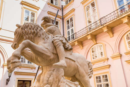 BRATISLAVA, SLOVAKIA - AUGUST 27, 2019: sunlight is enlightening Fountain of Saint George and the Dragon in The Primatial Palace in Bratislava, capital of Slovakia