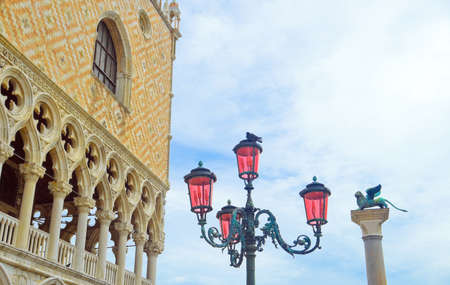 Doge Palace in Venice with gothic decoration and Saint Mark Lion (with clouds and copy space)