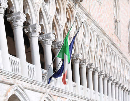 Italian and the European Union flags waves outside the Palazzo Ducale in Venice