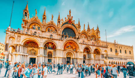 VENICE, ITALY - MAY 12, 2017: Square of the Holy Mark (Piazza San Marco) and St. Mark's Cathedral (Basilica di San Marco) with tourists, Italy.