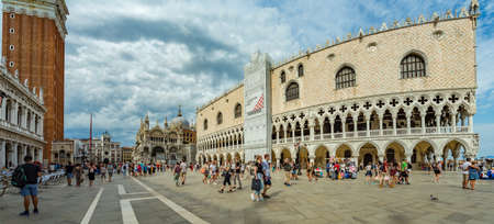 St. Mark Square, VENICE, ITALY - August 02, 2019: Loggetta del Sansovino museum, Torre dell Orologio, Basilica and Museum San Marco Locals and tourists strolling along the historical buildings.