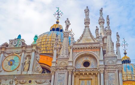 Picture the top of the church on the main square of Venice with details of decoration. Italy.