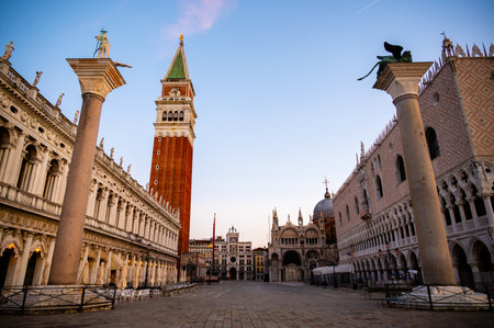 Golden morning light shining on St Mark’s Square in peaceful Venice.