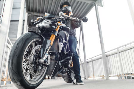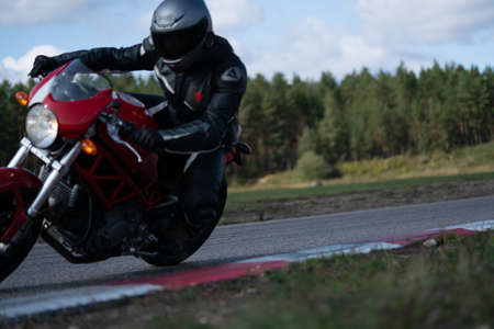 09/19/2020 Riga Latvia Handsome motorcyclist in black riding his super sport motorcycle