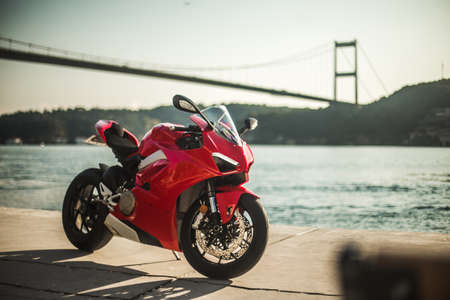 Red brand motorcycle at the port, under the bridge