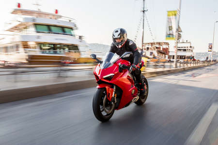 Biker driving a red motorcycle at the sea port