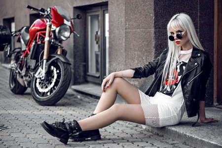 Beautiful blonde young model in posing outdoors