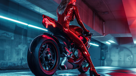 Futuristic female rider in a red suit with a motorcycle.