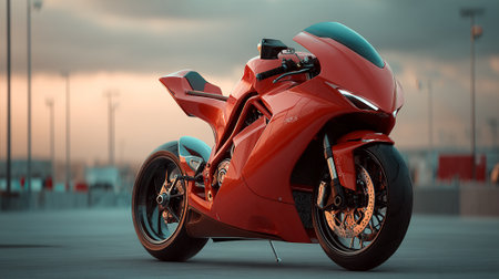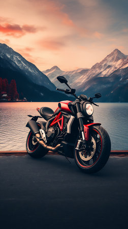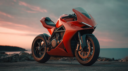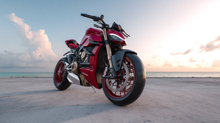 Striking Red Motorcycle Parked Near the Ocean at Dusk, Modern Design
