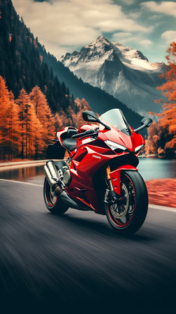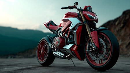 Sleek Red Motorcycle on Asphalt Road with Mountain Backdrop in Soft Light