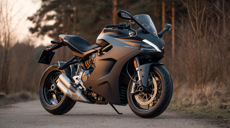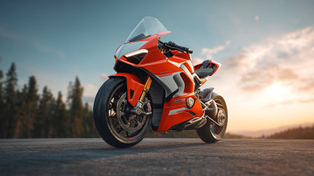 Sleek Red Motorcycle parked on Asphalt Road at Sunset with Trees