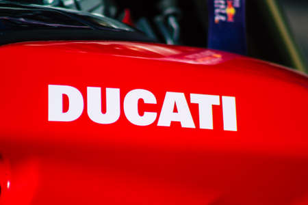 Bangkok, Thailand - December 2, 2018: Close up of a Ducati logo on a Ducati motorcycle tank at Bangkok Motor Expo exhibition in Bangkok, Thailand