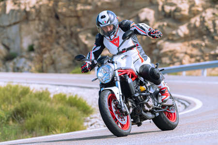 Almeria, Spain - May 5th 2021: Man riding a BMW S 1000 R motorcycle in a mountain road, during Dunlop Xperience event in Almeria, Spain.