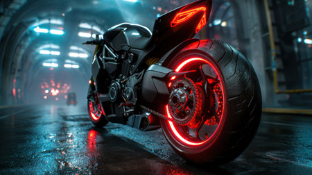 Futuristic motorcycle with glowing red lights in a dark, rainy city