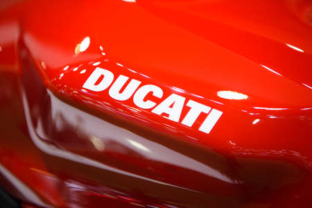 Bucharest, Romania - April 4, 2014: The tank of a Ducati motorcycle is displayed at a motorcycle show in Bucharest, Romania. Ducati Motor Holding S.p.A. is an Italian company that designs and manufactures motorcycles