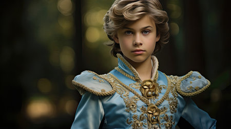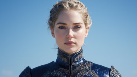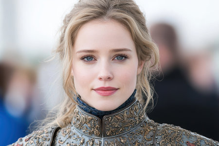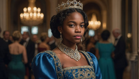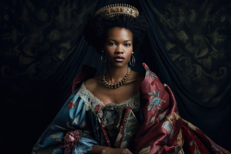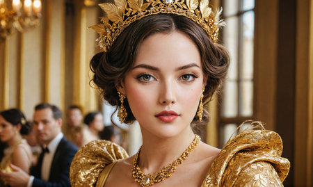 Portrait of a woman with a regal and majestic expression, adorned with a crown and draped in luxurious fabrics