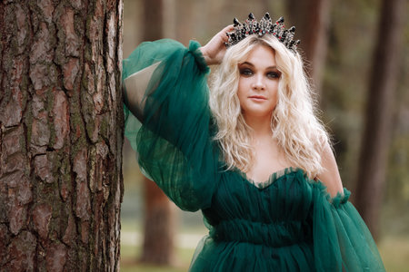 young beautiful blonde hair woman queen. Princess walks. autumn green forest mystic. Vintage medieval shiny crown. Long evening green dress. magic fantasy.