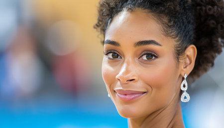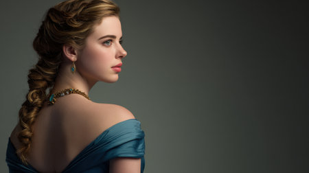 Elegant woman portrait profile vintage style blue dress jewelry braided hair soft lighting beauty classic fashion