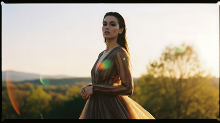 A woman in a shimmering golden dress poses gracefully against a beautiful sunset field background.
