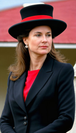 A woman in elaborate historical costume rides a black horse. The scene features a cloudy sky and open landscape. Rich colors and textures adorn the woman's clothing and the horse's tack. This image could be used for historical themed content or to represent royalty. Suitable for various editorial and commercial purposes.