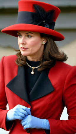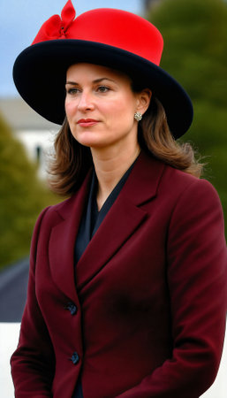 photo of beautiful lady europe woman with red coat and hat standing at garden, generative AI