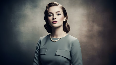 A classic portrait of a beautiful woman styled in 1950s fashion with winged eyeliner, red lipstick, and a pearl necklace. Her elegant vintage look and wavy hair evoke the glamour of the mid-century era.