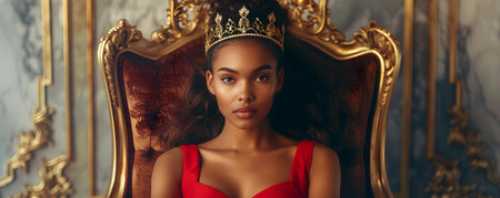 Royal woman adorned with crown elegantly perches upon regal golden throne. Concept Royal Portrait, Crowned Elegance, Regal Throne, Majestic Woman, Golden Beauty