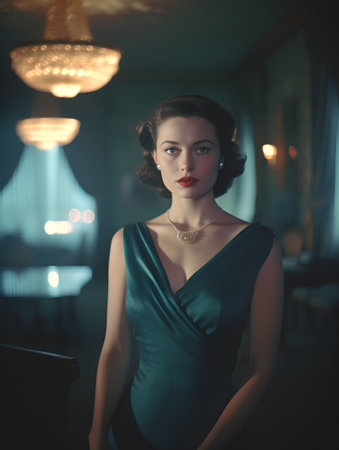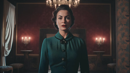 Immerse yourself in a 1960s-inspired vintage dream This image captures a stylish woman's elegance with chic attire, graceful posture, and warm tones Bright pops of color elevate the classic look, offering timeless style and perfect wardrobe inspiration Discover fashion that transcends eras AI Generative