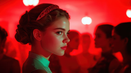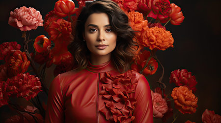 Elegant woman in vibrant red showcases her individuality and confidence in a centered pose. AI generative.