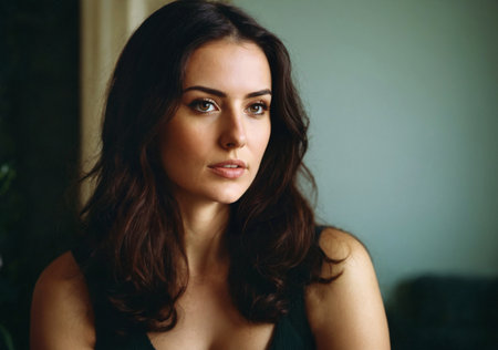 title: portrait of a thoughtful young woman with dark wavy hair, contemplative gaze, natural beauty concept, serene expression, indoor portrait with soft lighting
