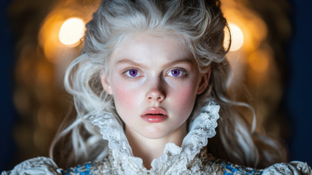 Ethereal portrait of a young girl with striking purple eyes and curly blonde hair