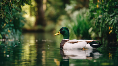 A tranquil scene featuring a duck gliding gracefully on calm waters, surrounded by lush greenery, showcasing the beauty of nature.