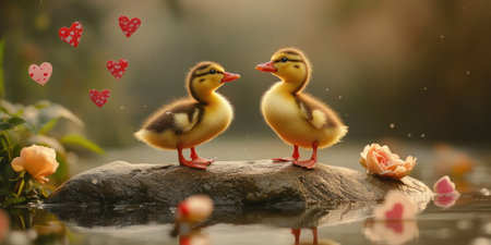 Two cute baby ducks standing on a rock in the water, with roses and heart-shaped paper dolls floating around them. The image has a romantic, cute aesthetic and is a high-quality photograph. --ar 2:1 --v 6.1 Job ID: 56da6508-4ad6-497c-a8f3-8cd499c39277