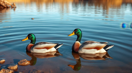 A picturesque scene featuring two colorful ducks swimming peacefully in a serene lake. Surrounding autumn leaves and soft morning light enhance the tranquil atmosphere.