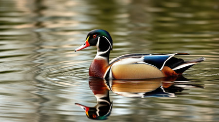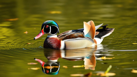 Colorful wood duck swimming in tranquil water reflecting its vibrant plumage in a serene natural setting